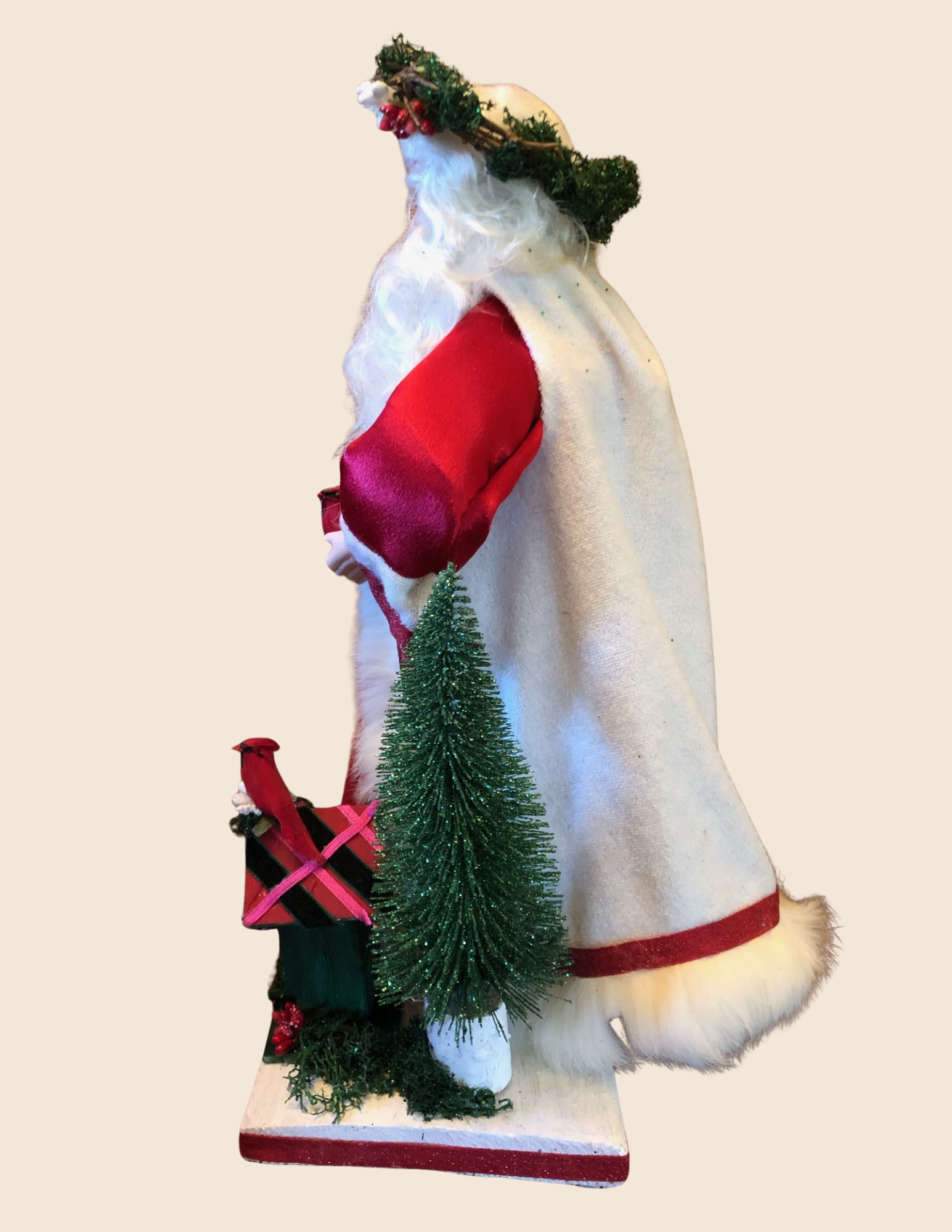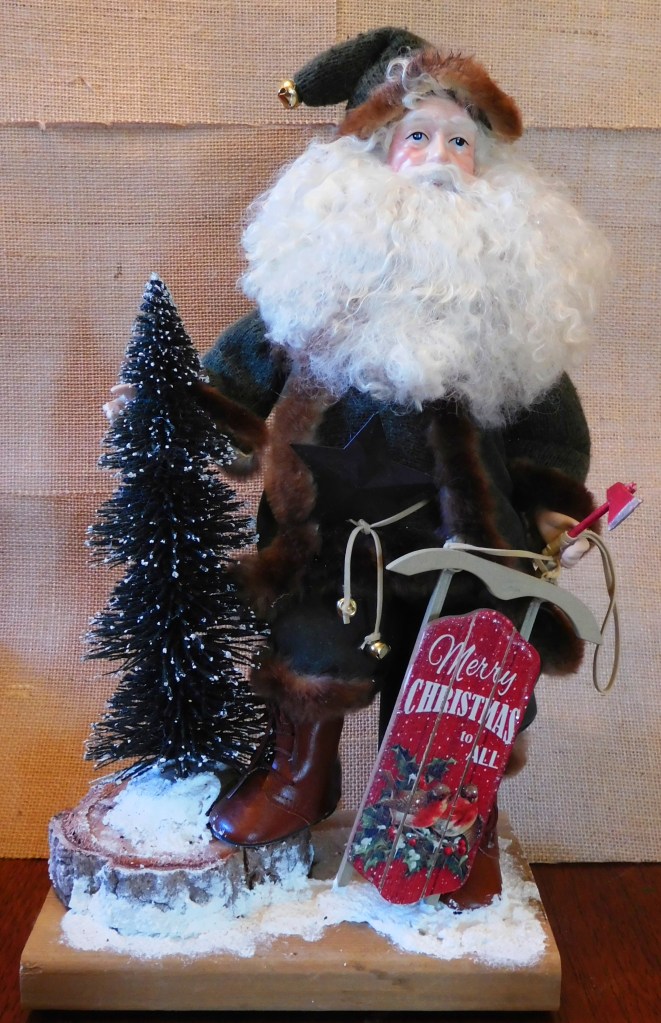 With axe and sleigh in hand, Santa ventures into the forest for his Christmas tree. His fabrics are forest green suede and a sweater trimmed with beaver fur. On his feet are brown leather boots. His hat and belt are trimmed with bells and a rustic star is tucked into his belt, ready to top the tree. His red sleigh sports a delightfully decorated message: “Merry Christmas to all.”