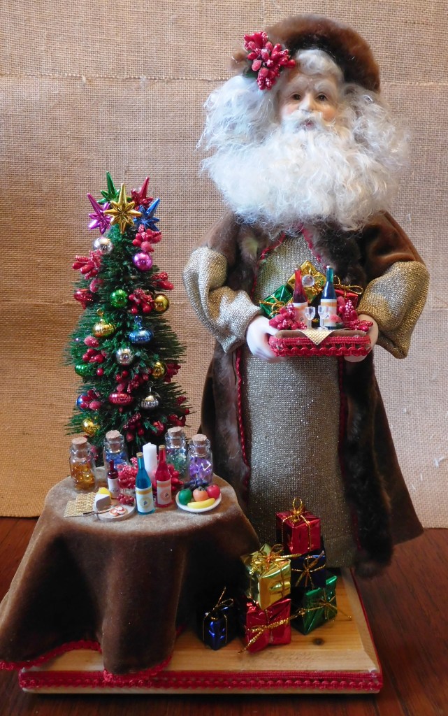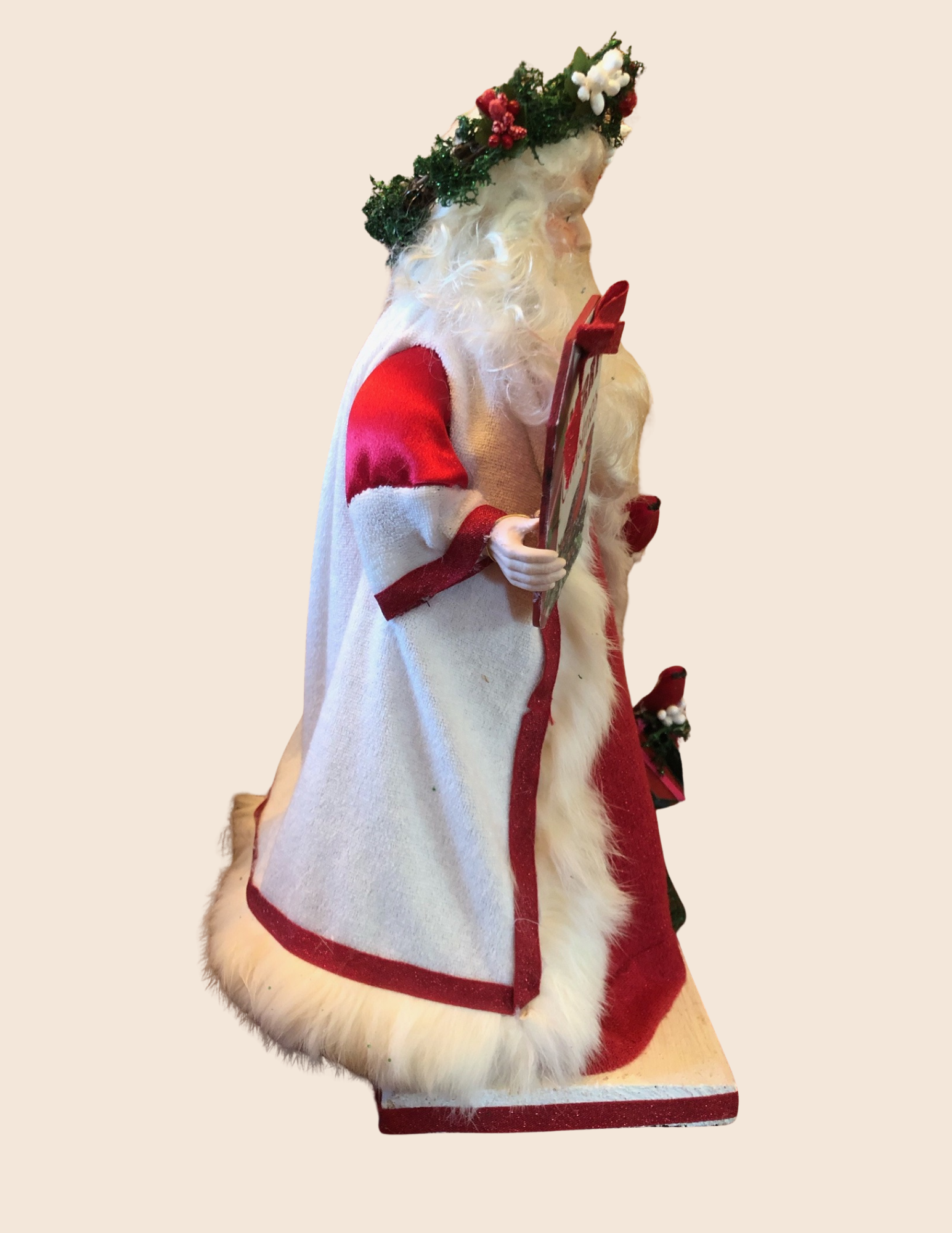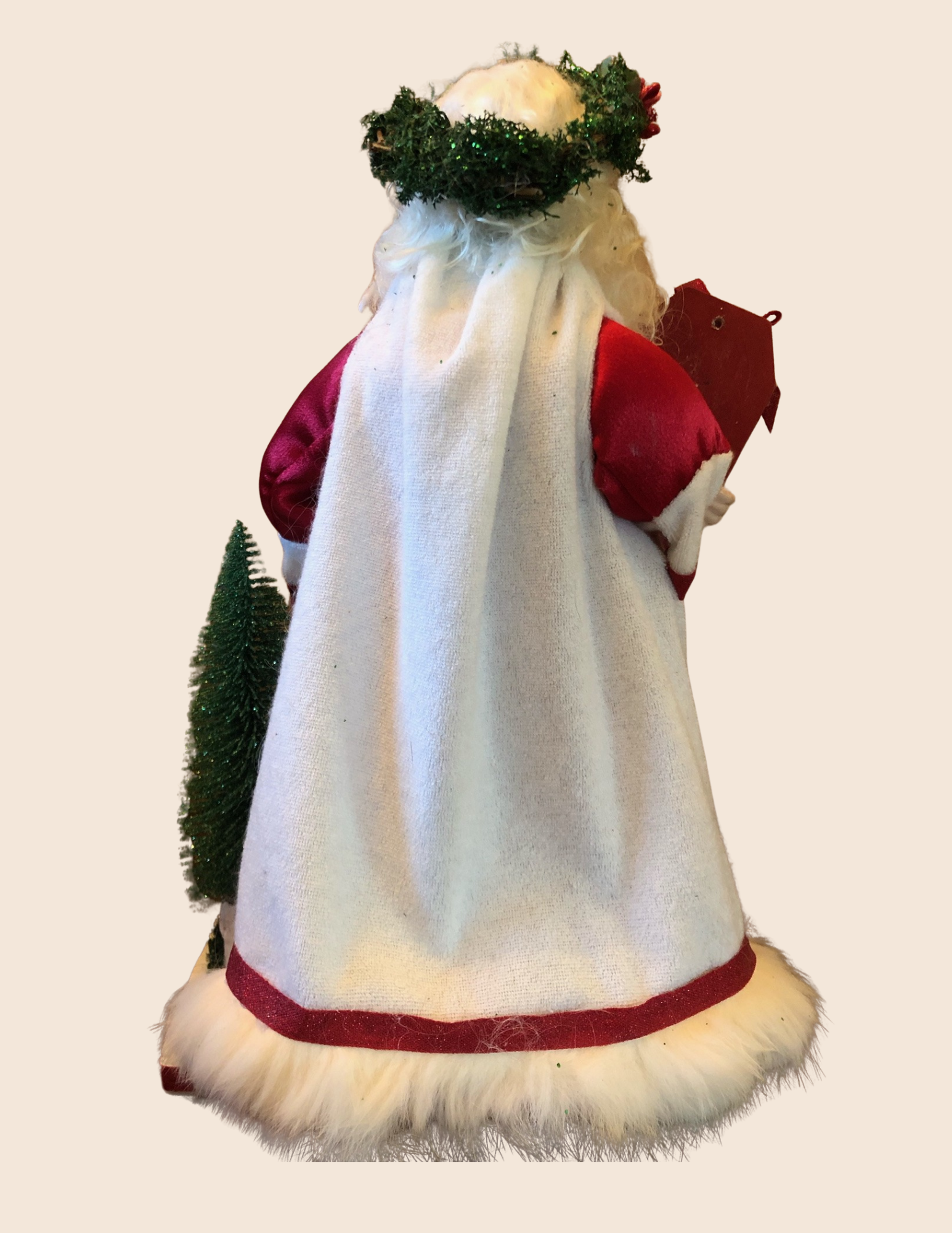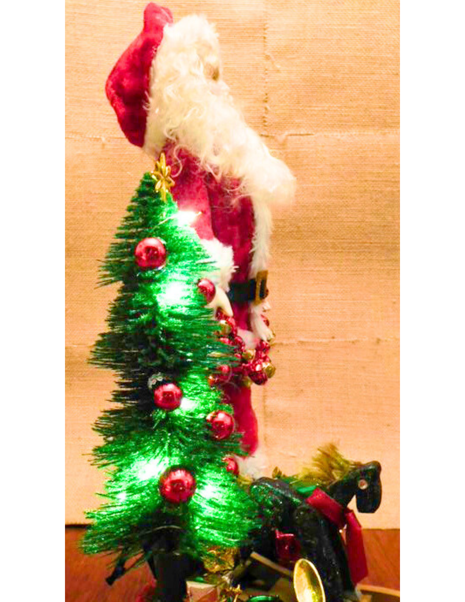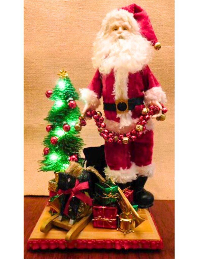 With lighted garland in hand and an an old fashioned lantern at his feet, Santa is decking the halls. He is wearing a deep burgundy velour coat, trimmed with real rabbit fur, over a patterned gold fabric dress. The lighted garland is handmade using an old pearl necklace and gold beading. Santa stands on a trimmed wooden base. Lights operated by button cell battery.