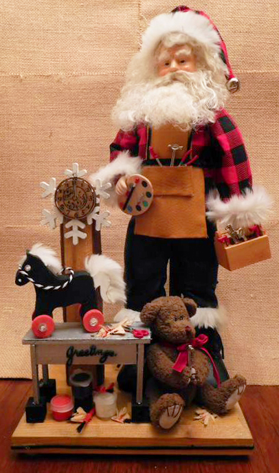 Busy in his workshop, Santa asks “Teddy” to give him a “paw” to make his Christmas toys.