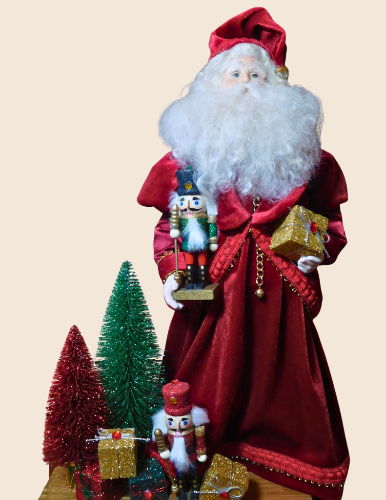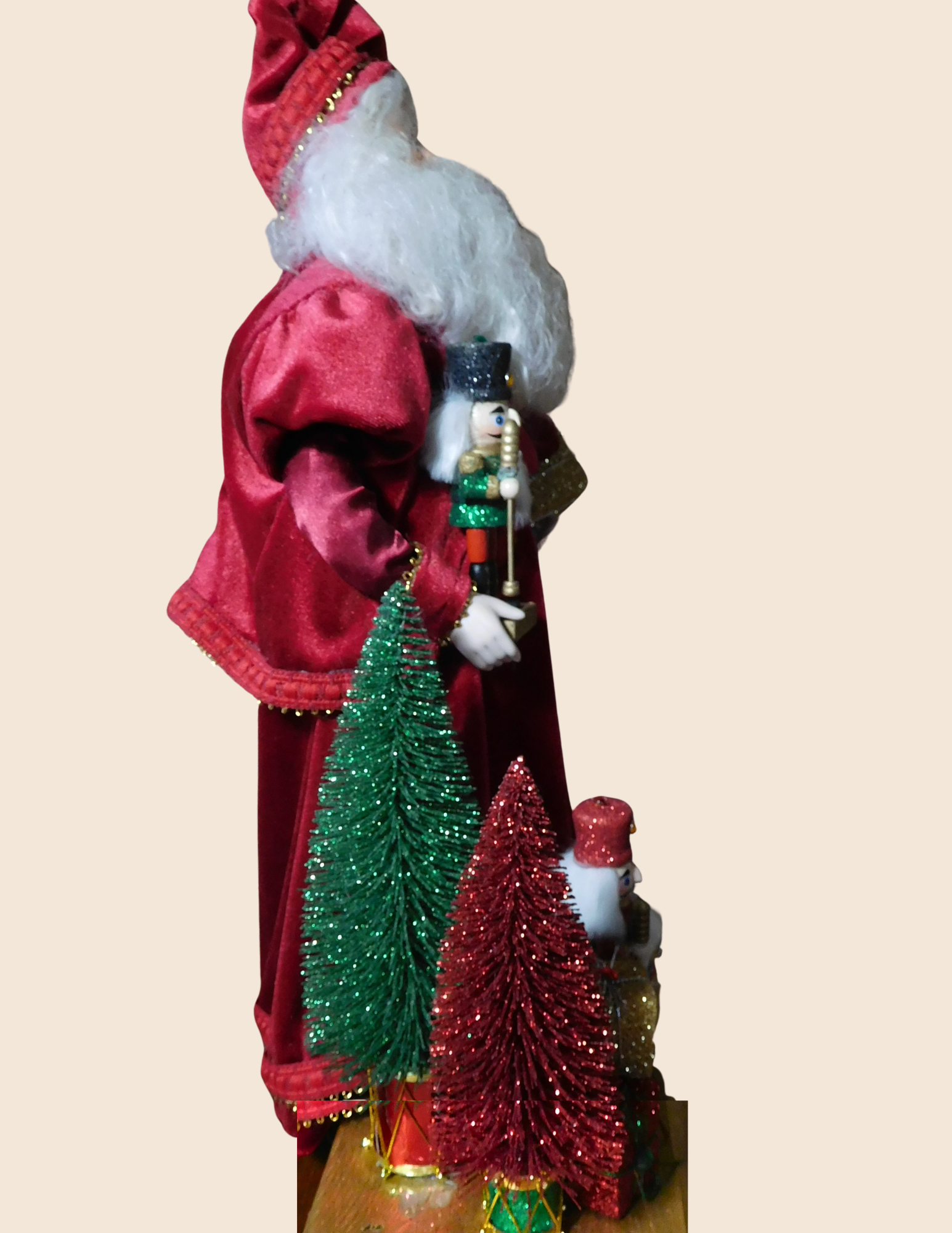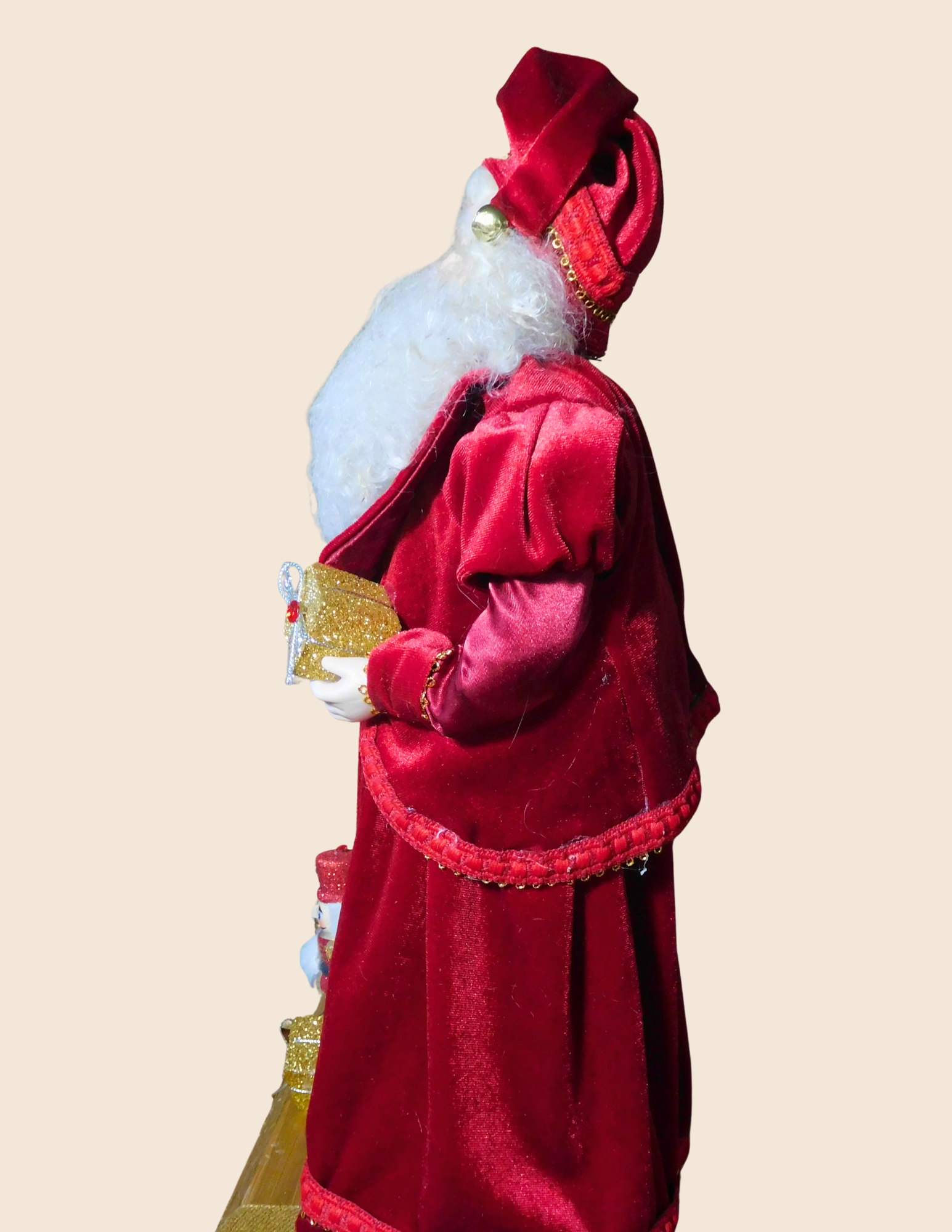 Santa is all decked out in a burgundy velvet trimmed coat with strings of gold jewels draped over a gold lamé dress. He is surrounded by stacks of presents under a gold glitter tree and bell wreath. His handsome Nutcracker stands on guard.