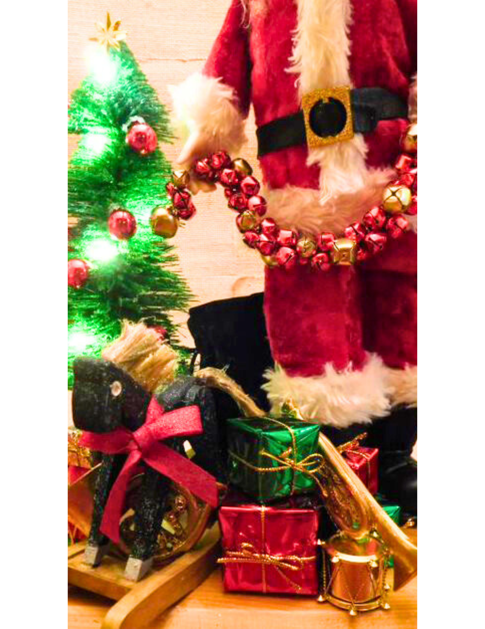 Deer Santa sports a champagne sequin jacket over a gold silk gown, with white rabbit fur trim. By his side is his trusty reindeer (in gold metal), alongside embossed metal Christmas trees. In his hands he holds a red and gold bell wreath and presents neatly wrapped in red ribbon.